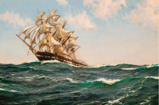 A merchant clipper’s bow cuts through the whitecaps atop an ocean swell, while a bright afternoon sun illuminates her full sails in this outstanding work by Montague Dawson. Like so many of Dawson’s ship portraits he’s chosen to portray a vessel of historic importance. This ship, the JOSHUA BATES, would ignite the career of her brilliant designer, Donald McKay- a pioneer whose elegant sharp bows and sweeping lines created the fastest and most reliable merchant clippers ever built.