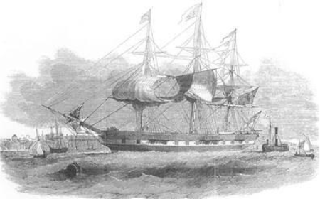 The Blue Jacket arrived in the Mersey on 20th October, 1854. Length of keel 205 feet. Length between perpendiculars 220 feet. Length overall 235 feet. Beam 41.6 feet. Depth of hold 24 feet. Registered tonnage 1790 tons. Her poop was 80 feet long and 7 feet high, and she had 8 feet of height between decks. She had the usual accomodation arrangements, two points only being perhaps worth noting; the first was a line of plate glass portholes running the length of her ‘tween decks, and the second was an iron water tank to hold 7000 gallons.