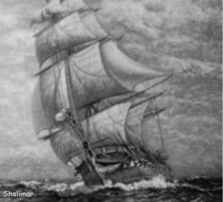 The wooden hulled clipper Shalimar was built in 1853 exclusively for the White Star Line by J. Nevins of St. John in New Brunswick, Nova Scotia. She was an Australian immigrant vessel and made frequent trips from Australia and New Zealand. She arrived in the Mersey on 20th October, 1854. Her registered tonnage was 1557 tons, length195.8 feet, and beam 35.2 feet. She sailed around the world 4 times in 2 years.